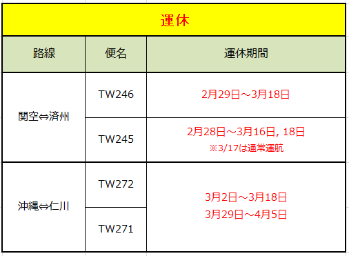 下記の通り、一部日韓路線が非運航となりましたことをお知らせいたします。