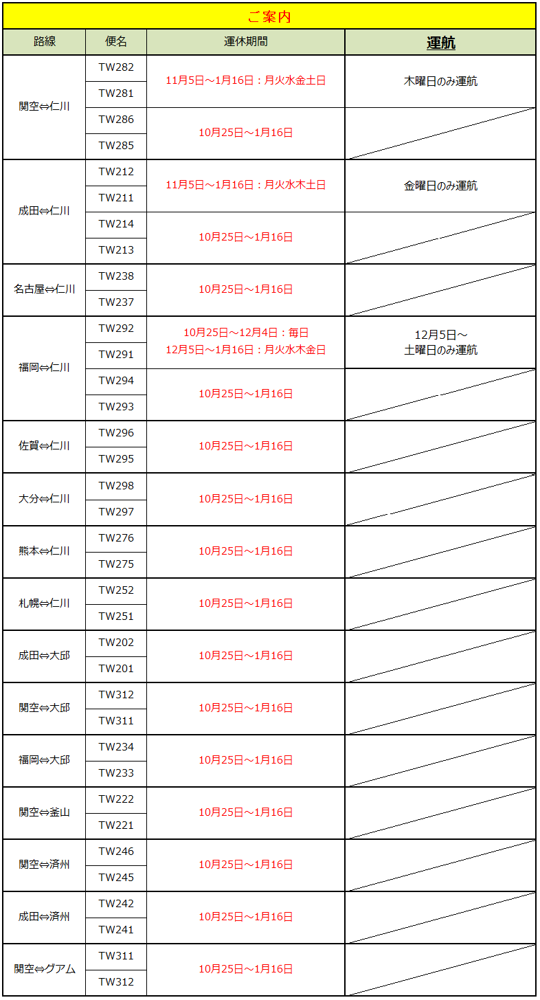 平素よりティーウェイ航空をご利用いただきまして誠にありがとうございます。