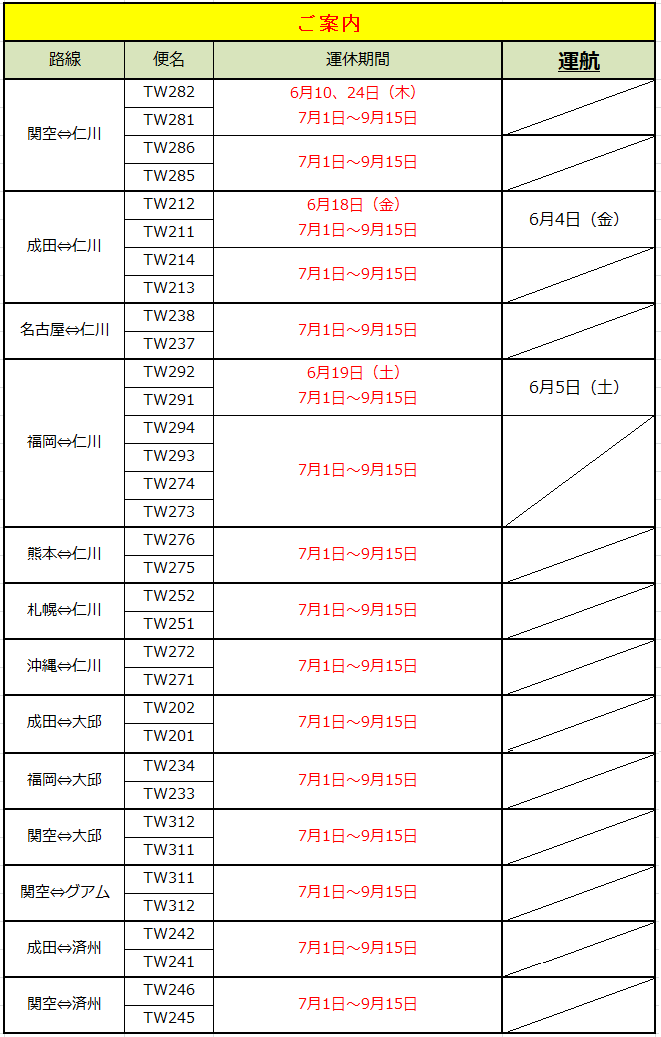 平素よりティーウェイ航空をご利用いただきまして誠にありがとうございます。