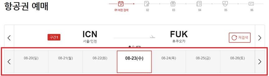 2) 항공권 운임 선택 화면> 상단 날짜 영역 최저가 미표기 예시