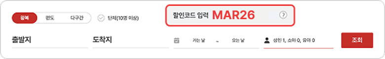 - 할인코드는 편도/왕복 예매 시 모두 사용 가능합니다.