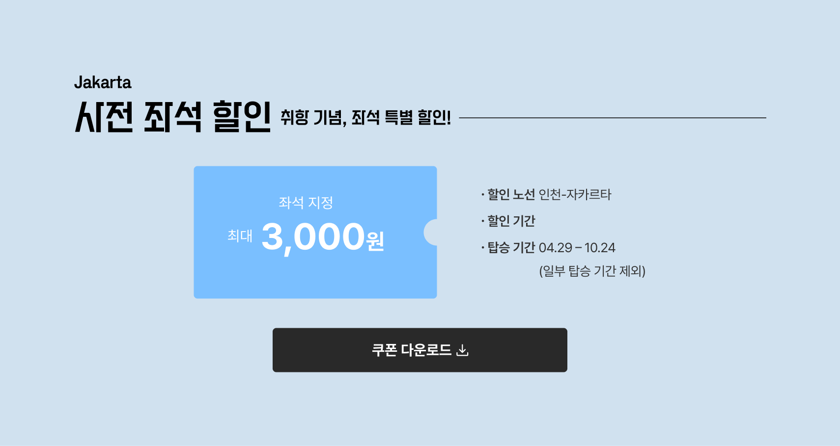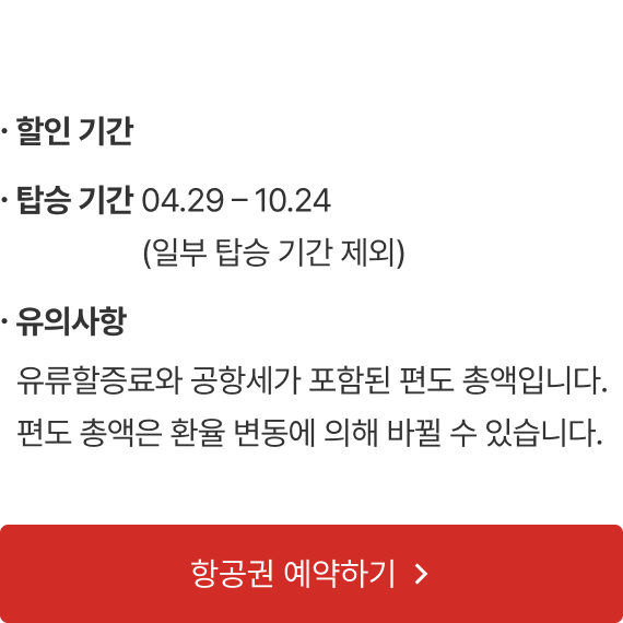 - 영업 정책에 따라 노선 별 탑승기간 중 해당 특가운임이 적용되지 않는 일자도 발생될 수 있으니 이 점 양지하여 주시기 바랍니다.