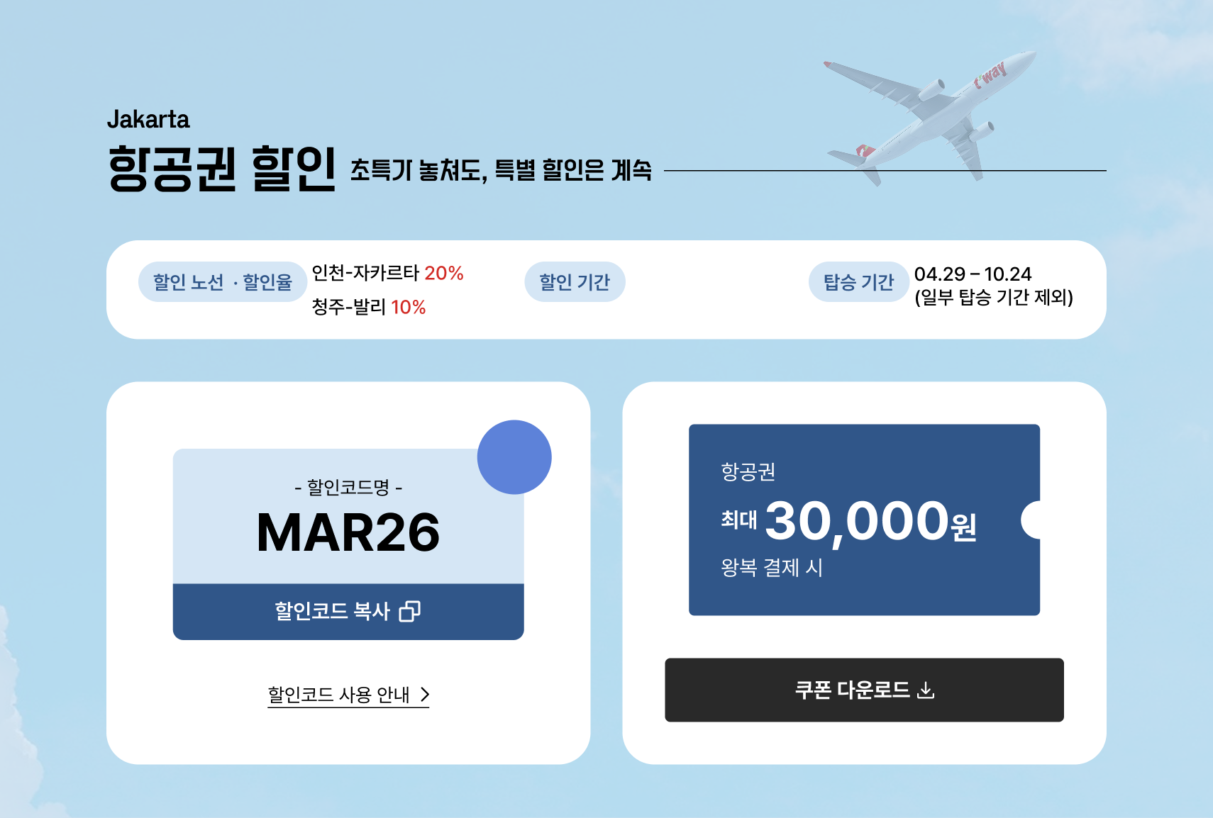 - 할인코드는 유류할증료와 공항시설 사용료를 제외한 항공 운임에서 할인됩니다.