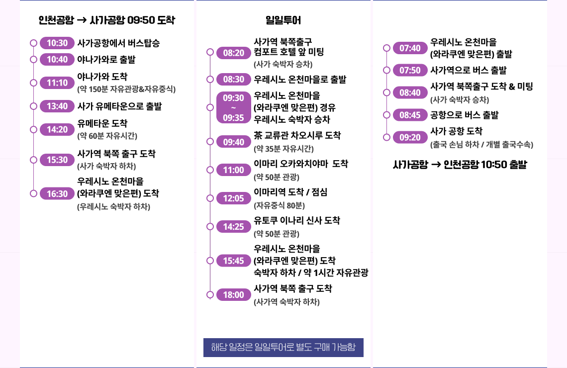- 투어버스 일정은 사정에 따라 사전 고지 없이 변경될 수 있으며, 이에 관한 문의는 와쿠와쿠 버스로 문의하여 주시기 바랍니다.
