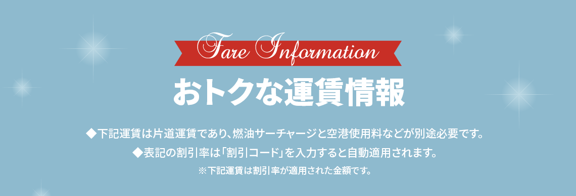 - 片道総額運賃は予約時点の為替レートにより変動される場合がございます。
