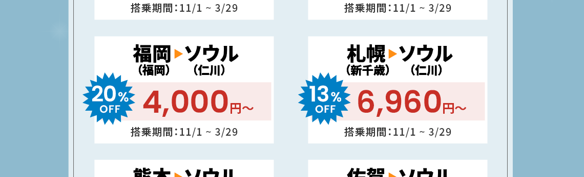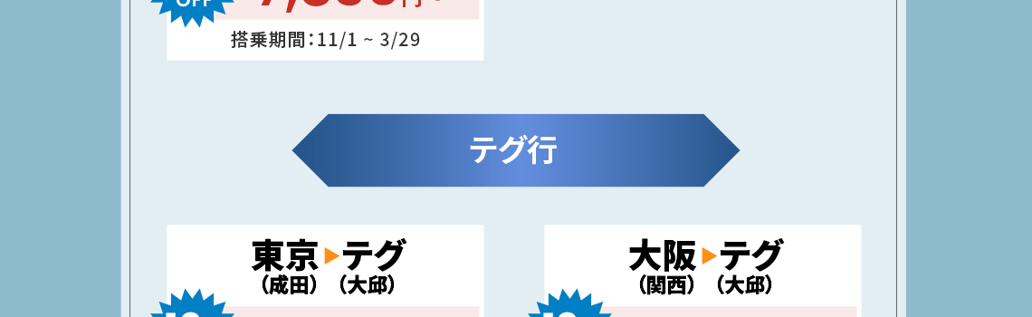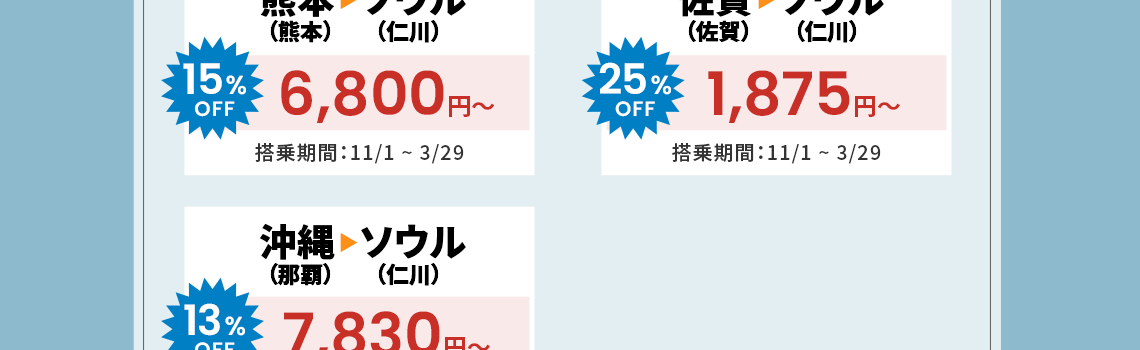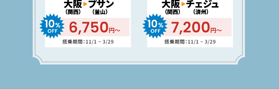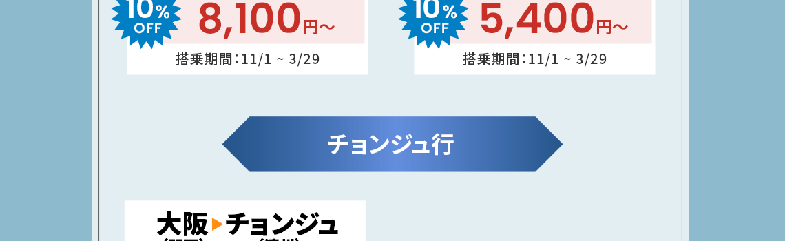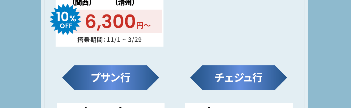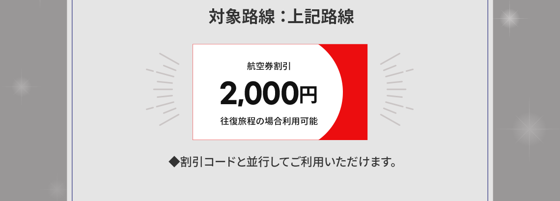 - 営業ポリシーにより、路線別の搭乗期間中に該当割引コードが適用されない日付も発生することがありますので、ご了承ください。