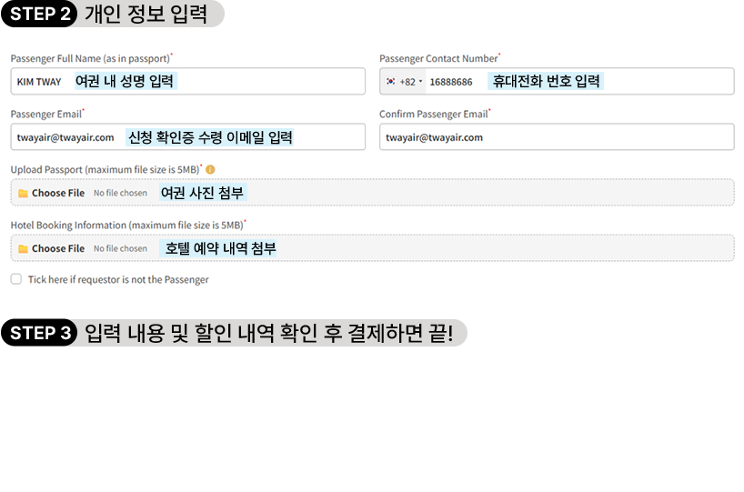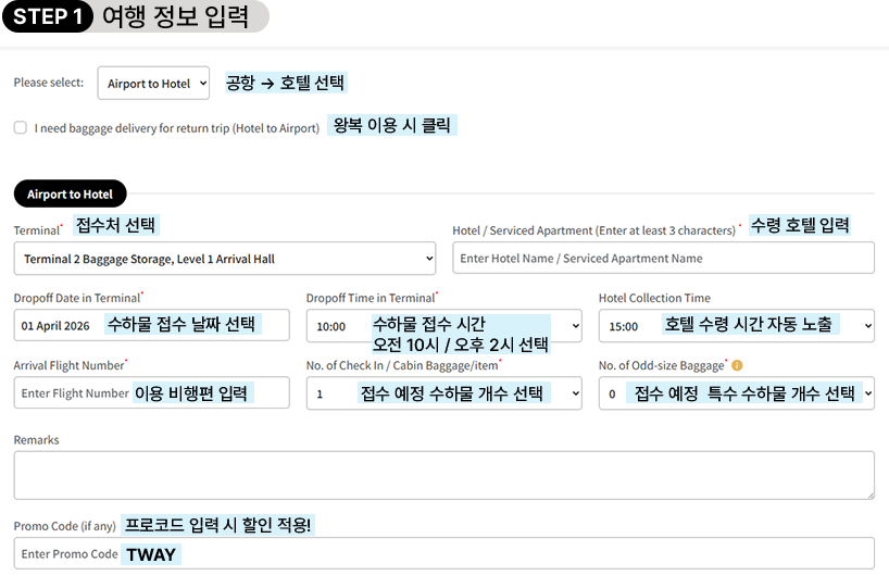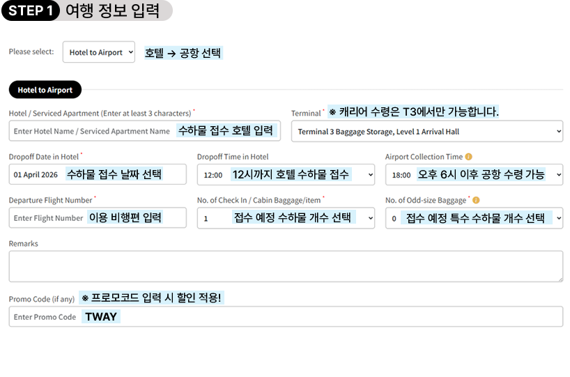 ① 공항 → 호텔② 호텔 → 공항STEP 3신청서 하단의 프로모션 코드