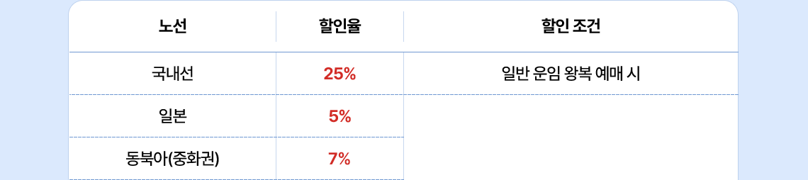 - 국내선 왕복 예약 시, 일반 운임에 한하여 25% 할인됩니다.(이벤트/스마트/비즈니스 운임 할인 불가, 편도/다구간 할인 불가)