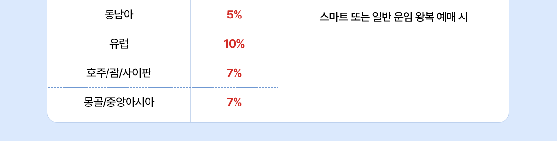 - 국제선 왕복 예약 시, 스마트 및 일반 운임에 한하여 최대 10% 할인됩니다.(이벤트/비즈니스 운임 할인 불가, 편도/다구간 할인 불가)