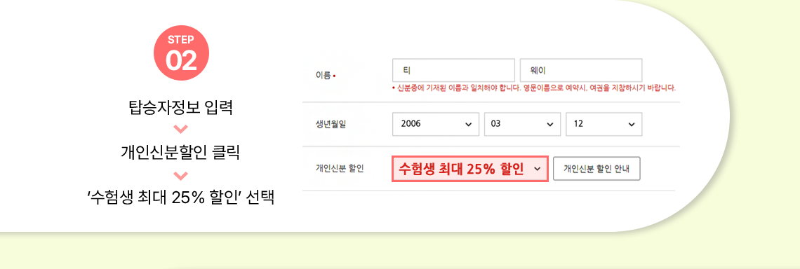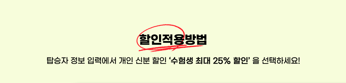 탑승자 정보 입력에서 개인 신분 할인 '수험생 최대 25% 할인'을 선택하세요!