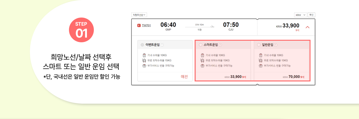 스마트 또는 일반 운임 선택 *단 국내선은 일반 운임만 할인 가능