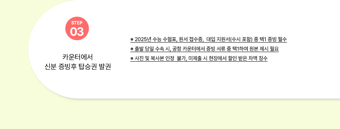 ※ 출발 당일 수속 시, 공항 카운터에서 증빙 서류 중 택1하여 원본 제시 필요