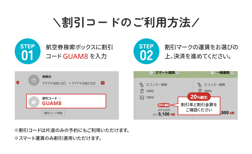 - 営業ポリシーにより、路線別の搭乗期間中に該当割引コードが適用されない日付も発生することがありますので、ご了承ください。