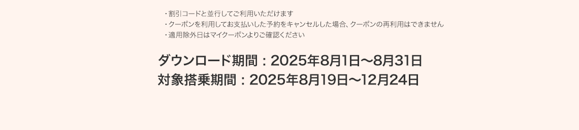 - 一部期間および運賃には割引コードがご利用できない場合がございます。