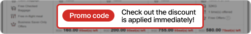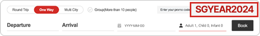 - Please note that there may be cases when the promotion code is not applied during the boarding period for each route depending on the sales policy.
