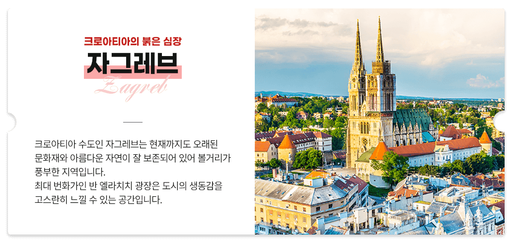 특별한 가을여행, 고즈넉한 바닷가 시골마을 료칸, 아름다운 축제 그리고 따듯한 사람들, 일본 소도시로 떠나는 일상의 쉼표, 디웨이항공과 함께 사가현의 아름다운 가을로 떠나보세요. 크로아티아 수도인 자그레브는 현재까지도 오래된 문화재와 아름다운 자연이 잘 보존되어 있어 볼거리가 풍부한 지역입니다. 최대 번화가인 반 엘라치치 광장은 도시의 생동감을 고스란히 느낄 수 있는 공간입니다.