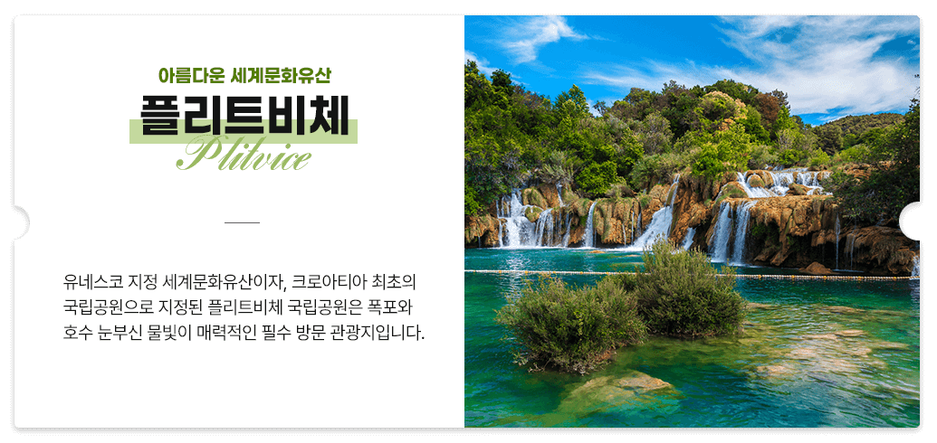 유네스코 지정 세계문화유산이자, 크로아티아 최초의 국립공원으로 지정된 플리트비체 국립공원은 폭포와 호수 눈부신 물빛이 매력적인 필수 방문 관광지입니다.