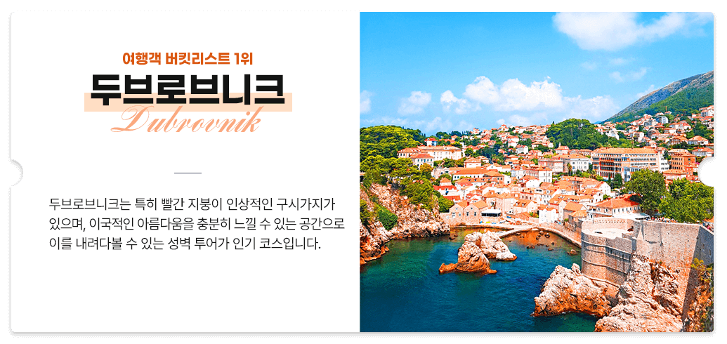 두브로브니크는 특히 빨간 지붕이 인상적인 구시가지가 있으며, 이국적인 아름다움을 충분히 느낄 수 있는 공간으로 이를 내려다볼 수 있는 성벽 투어가 인기 코스입니다.주 3회 운항 (매주 화·목·토)