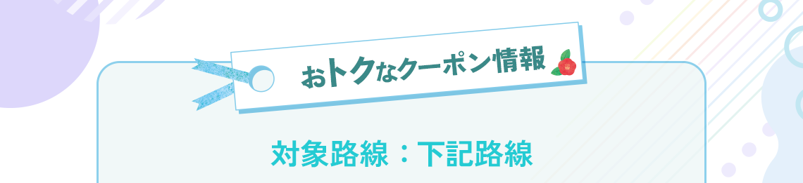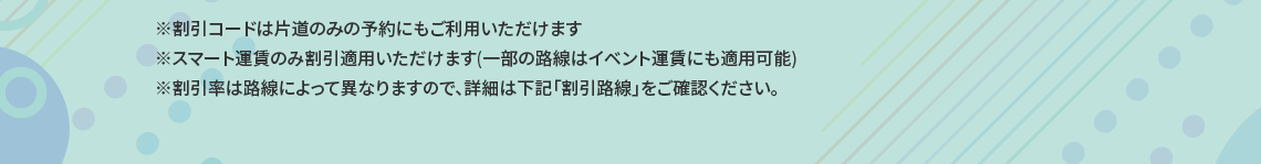 - 割引コードはスマート運賃のみご利用いただけます。(ただし、一部の路線はイベント運賃にも適用可能)