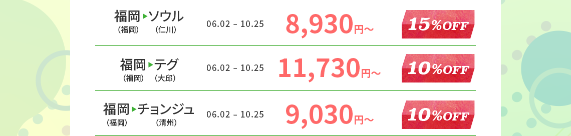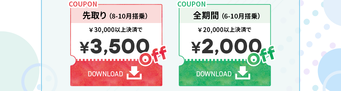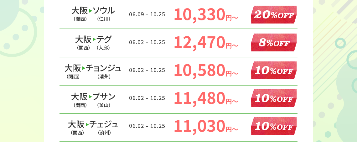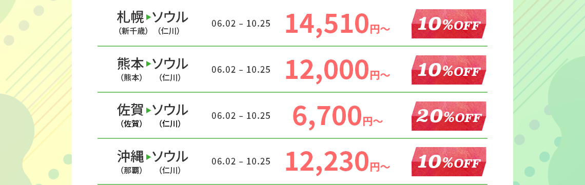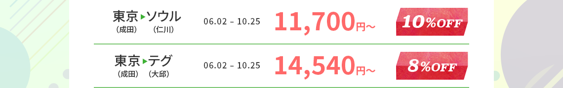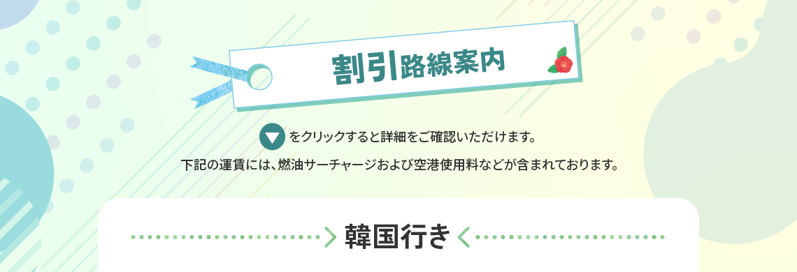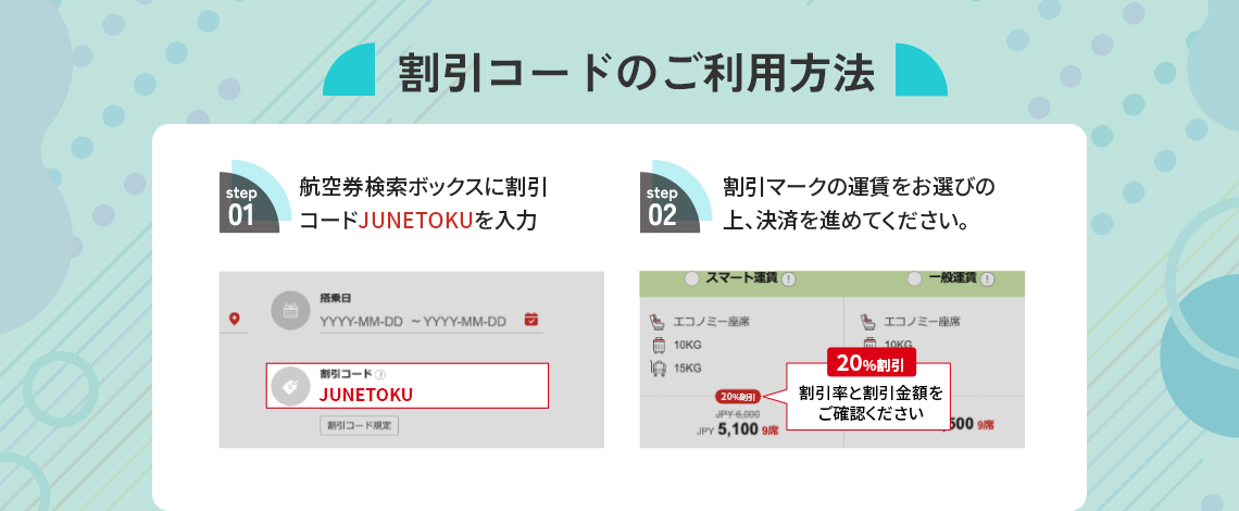 - 営業ポリシーにより、路線別の搭乗期間中に該当割引コードが適用されない日付も発生することがありますので、ご了承ください。