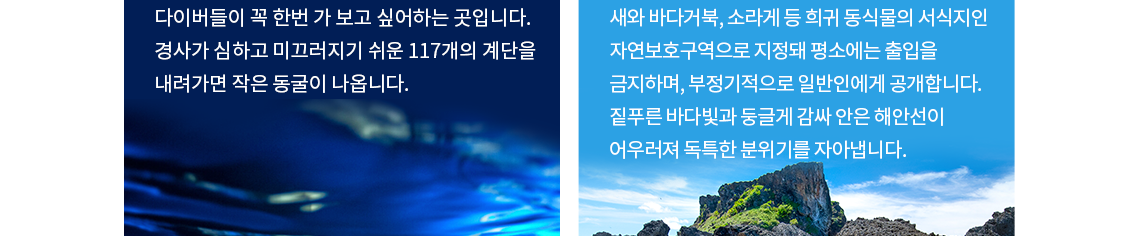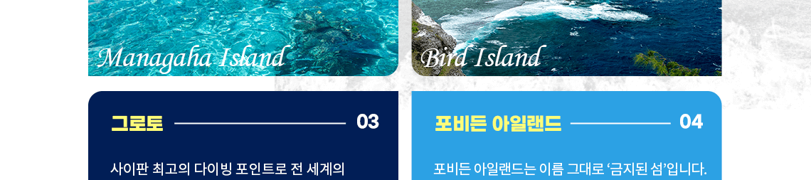 - 03. 그로토 (Grotto) : 사이판 최고의 다이빙 포인트로 전 세계의 다이버들이 꼭 한번 가 보고 싶어하는 곳입니다. 경사가 심하고 미끄러지기 쉬운 117개의 계단을 내려가면 작은 동굴이 나옵니다.