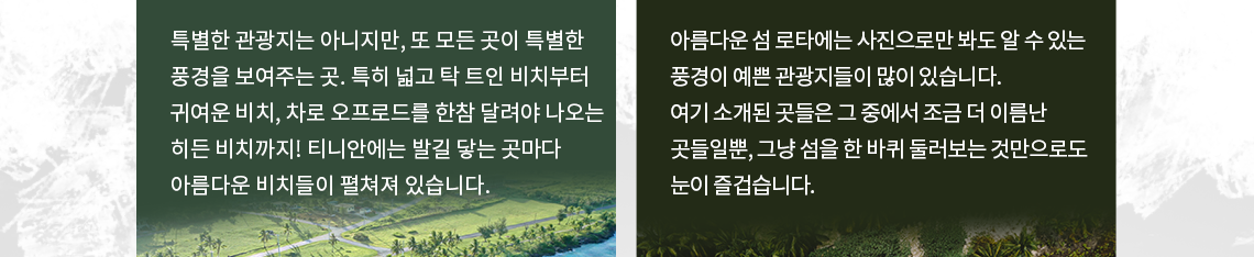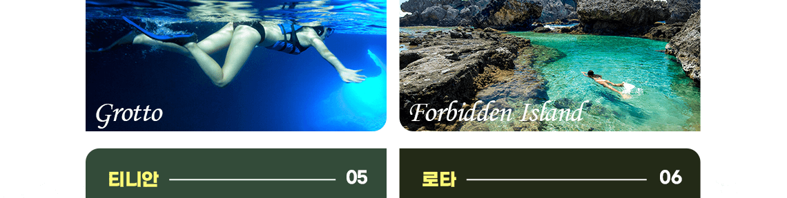 - 05. 티니안 (Tinian) : 특별한 관광지는 아니지만, 또 모든 곳이 특별한 풍경을 보여주는 곳. 특히 넓고 탁 트인 비치부터 귀여운 비치, 차로 오프로드를 한참 달려야 나오는 히든 비치까지! 티니안에는 발길 닿는 곳마다 아름다운 비치들이 펼쳐져 있습니다.