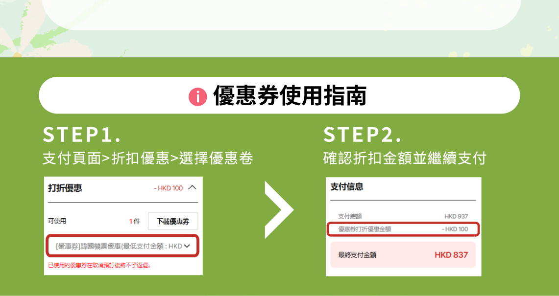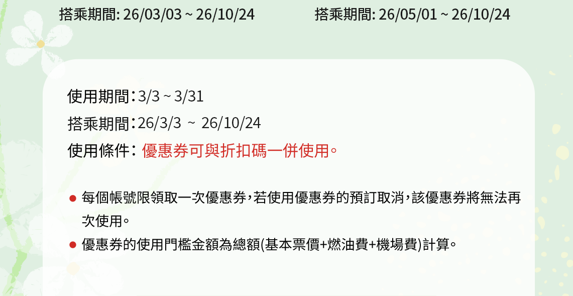 - 取消使用優惠券結算的預訂時,優惠券無法恢復。(機票/行李優惠券均適用)