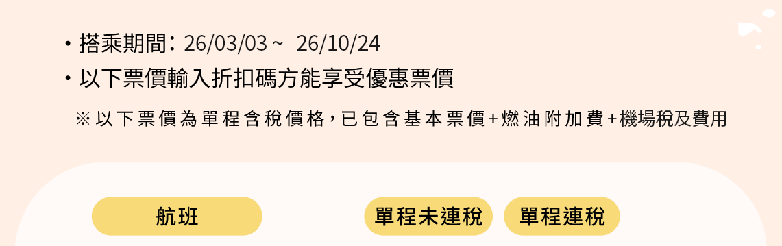 - 根據營業政策,各航線搭乘的期間中,可能會有不適用該特價票價的日期,敬請見諒。