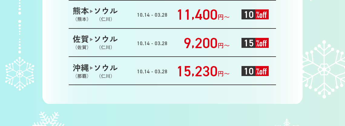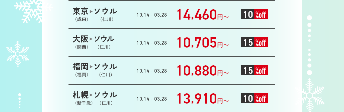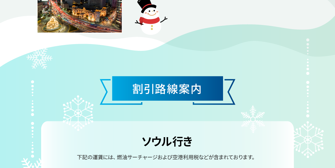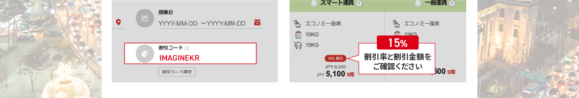- 営業ポリシーにより、路線別の搭乗期間中に該当割引コードが適用されない日付も発生することがありますので、ご了承ください。
