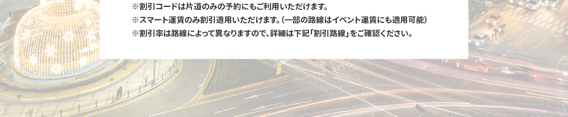 - 割引コードはスマート運賃のみご利用いただけます。(ただし、一部の路線はイベント運賃にも適用可能)