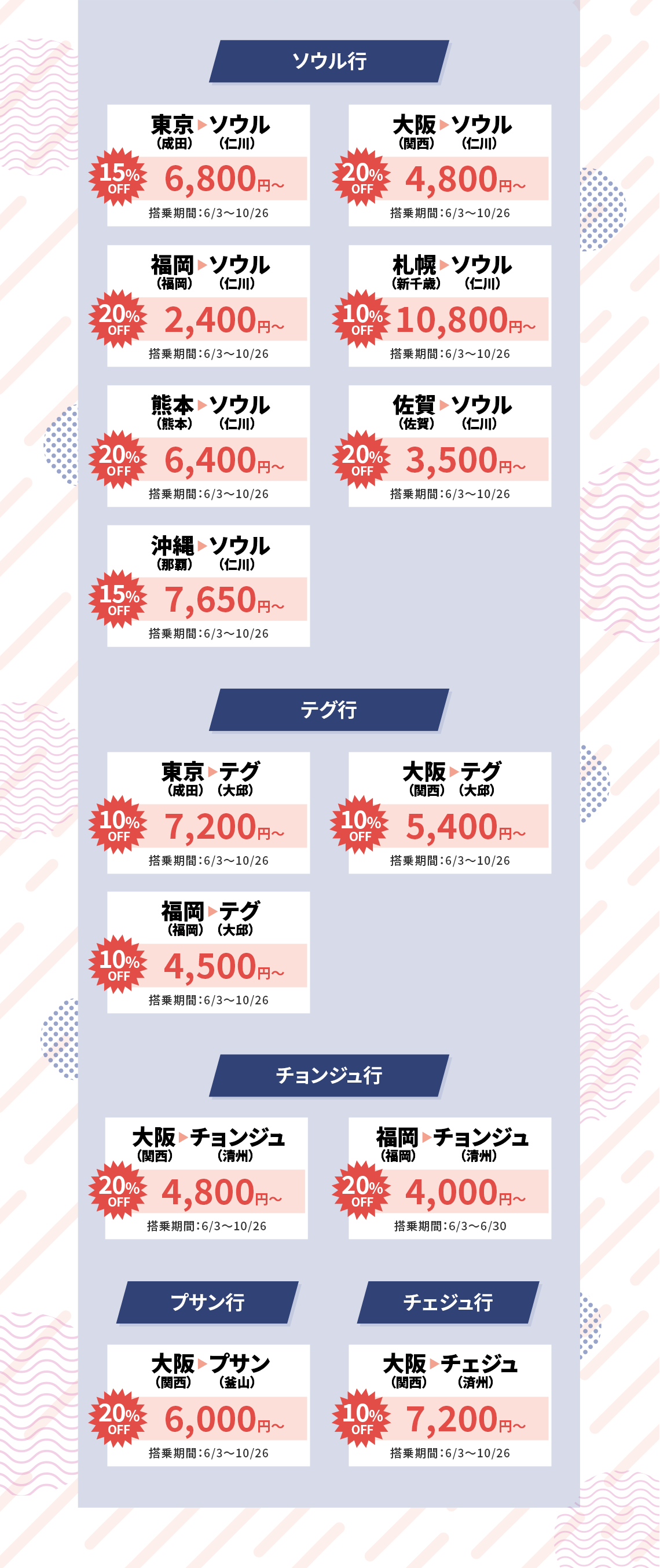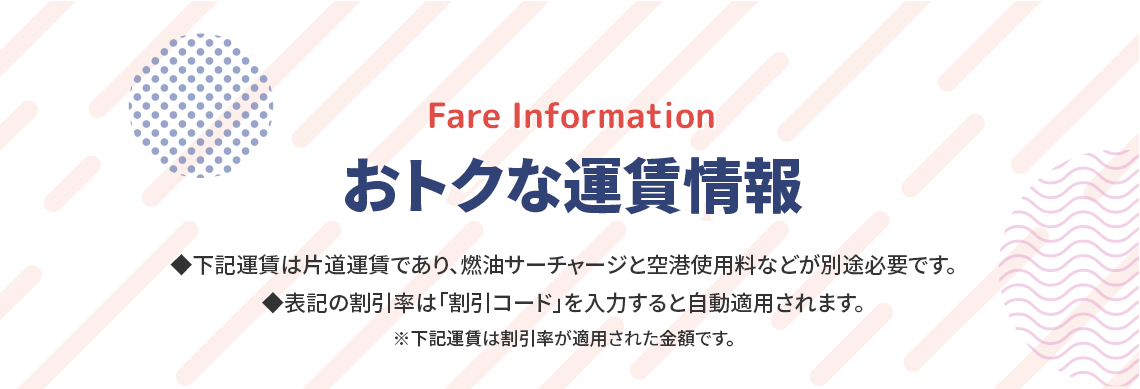 - 営業ポリシーにより、路線別の搭乗期間中に該当割引コードが適用されない日付も発生することがありますので、ご了承ください。