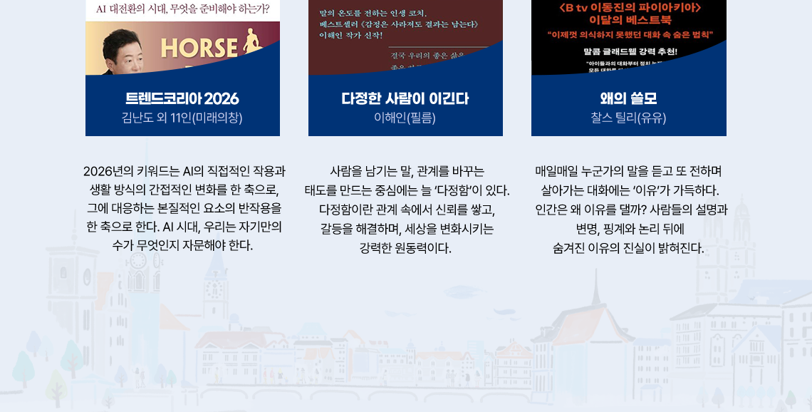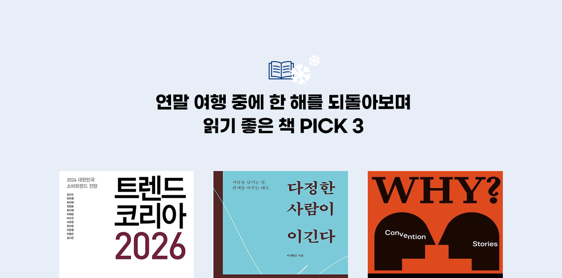 1. 2026년의 키워드는 AI의 직접적인 작용과 생활 방식의 간접적인 변화를 한 축으로, 그에 대응하는 본질적인 요소의 반작용을 한 축으로 한다. AI 시대, 우리는 자기만의 수가 무엇인지 자문해야 한다. 2. 다정한 사람이 이긴다 / 이해인(필름) 사람을 남기는 말, 관계를 바꾸는 태도를 만드는 중심에는 늘 ‘다정함’이 있다. 다정함이란 관계 속에서 신뢰를 쌓고, 갈등을 해결하며, 세상을 변화시키는 강력한 원동력이다. 3. 왜의 쓸모 / 찰스 틸리(유유) 매일매일 누군가의 말을 듣고 또 전하며 살아가는 대화에는 ‘이유’가 가득하다. 인간은 왜 이유를 댈까? 사람들의 설명과 변명, 핑계와 논리 뒤에 숨겨진 이유의 진실이 밝혀진다.