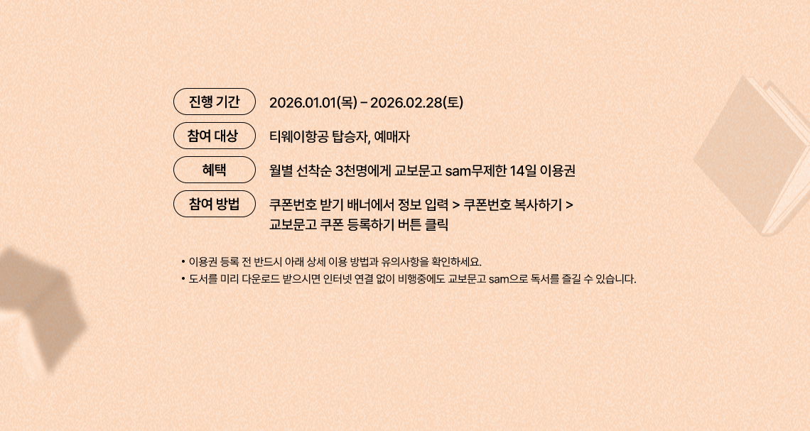 - 참여 방법: 쿠폰번호 받기 배너에서 정보 입력 > 쿠폰번호 복사하기 > 교보문고 쿠폰 등록하기 버튼 클릭 * 이용권 등록 전 반드시 아래 상세 이용 방법과 유의사항을 확인하세요. * 도서를 미리 다운로드 받으시면 인터넷 연결 없이 비행중에도 교보문고 sam으로 독서를 즐길 수 있습니다.