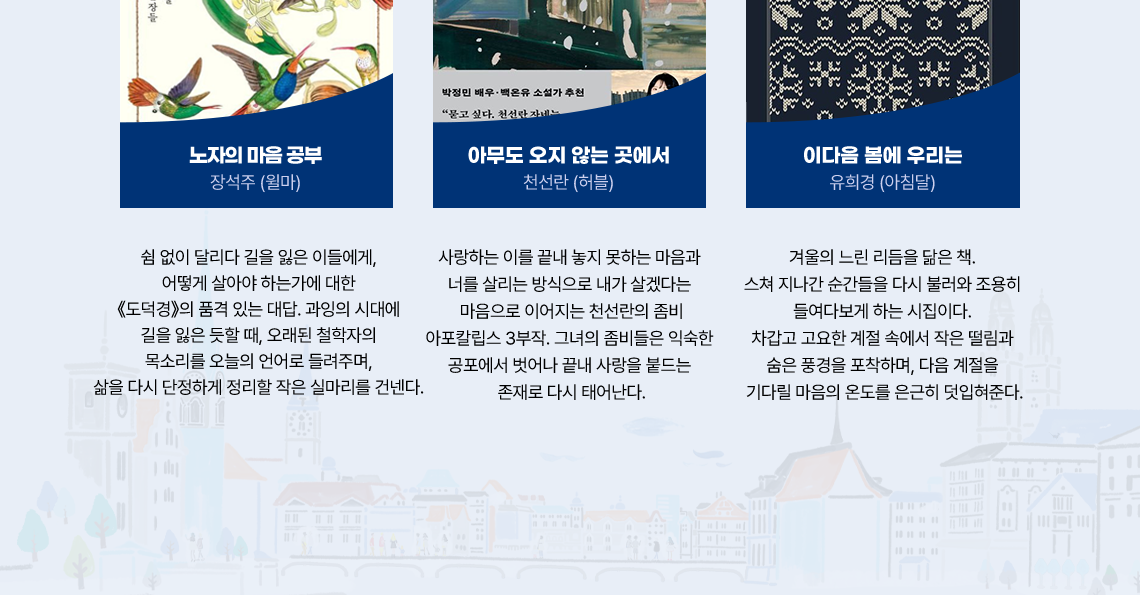 1. 노자의 마음 공무 / 장성주(윌마) 쉼 없이 달리다 길을 잃은 이들에게,어떻게 살아야 하는가에 대한《도덕경》의 품격 있는 대답. 과잉의 시대에 길을 잃은 듯할 때, 오래된 철학자의 목소리를 오늘의 언어로 들려주며,삶을 다시 단정하게 정리할 작은 실마리를 건넨다. 2. 아무도 오지 않는 곳에서 / 천선란(허블) 사랑하는 이를 끝내 놓지 못하는 마음과 너를 살리는 방식으로 내가 살겠다는 마음으로 이어지는 천선란의 좀비 아포칼립스 3부작. 그녀의 좀비들은 숙한 공포에서 벗어나 끝내 사랑을 붙드는 존재로 다시 태어난다. 3. 이다음 봄에 우리는 / 유의경(아침달) 겨울의 느린 리듬을 닮은 책. 스쳐 지나간 순간들을 다시 불러와 조용히 들여다보게 하는 시집이다. 차갑고 고요한 계절 속에서 작은 떨림과 숨은 풍경을 포착하며, 다음 계절을 기다릴 마음의 온도를 은근히 덧입혀준다.