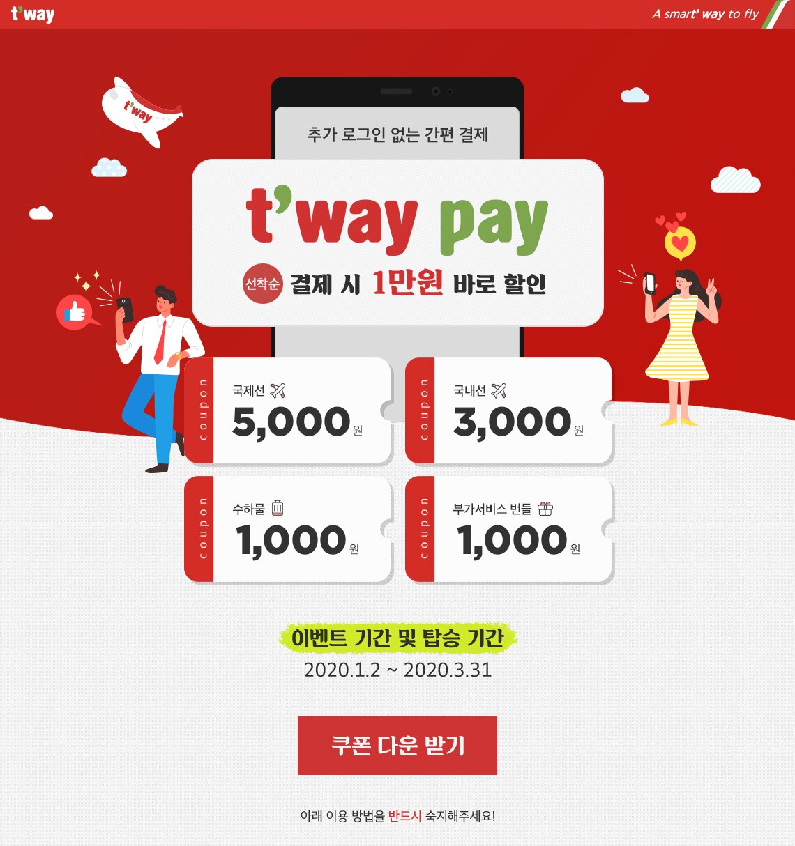 2020년 1월 2일부터 3월 31일까지 탑승 및 다운로드 가능한 쿠폰 할인 이벤트이며 전 노선에 한해 적용 가능합니다. 국제선 5천원, 국내선 3천원, 부가서비스 번들 1천원, 수하물 1천원 할인 적용 가능 쿠폰 이벤트입니다.