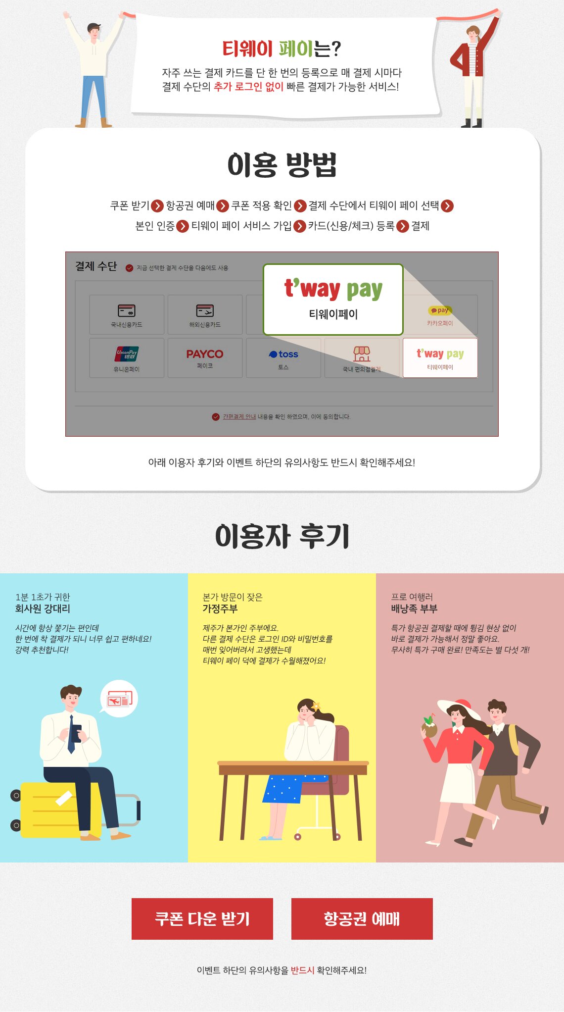 - 티웨이페이는 약관 동의 > 본인 인증 > 티웨이페이 간편 결제 서비스 가입 > 결제 수단 등록(신용/체크)을 통해 이용이 가능합니다.