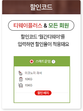 - 티웨이플러스 & 모든 회원 : 할인코드 '월간티웨이'를 입력하면 할인율이 적용돼요