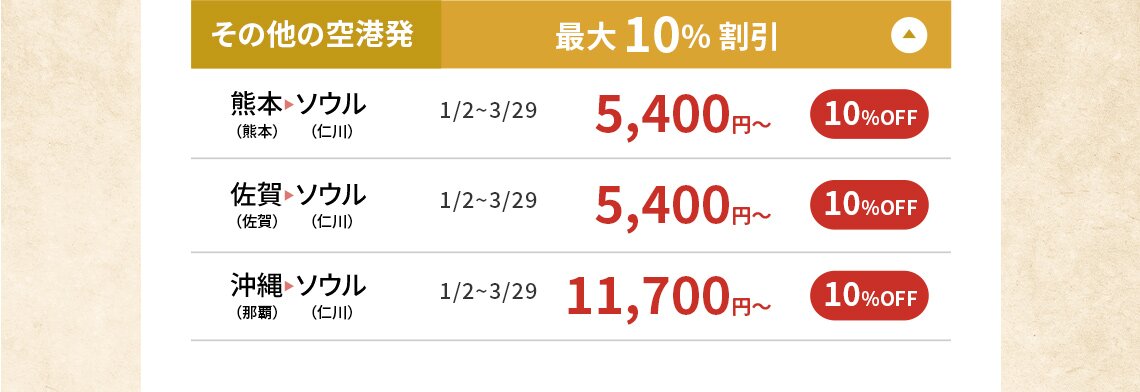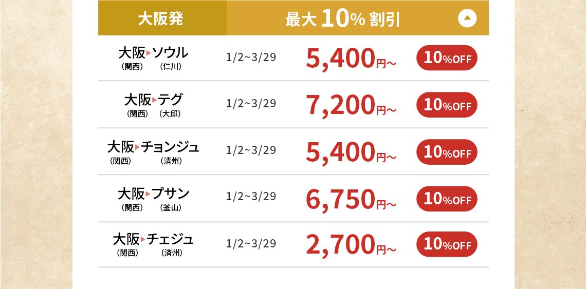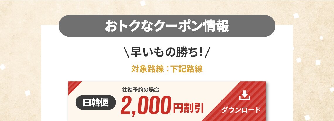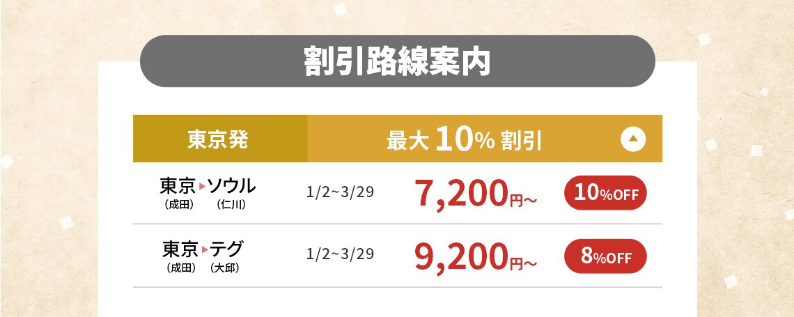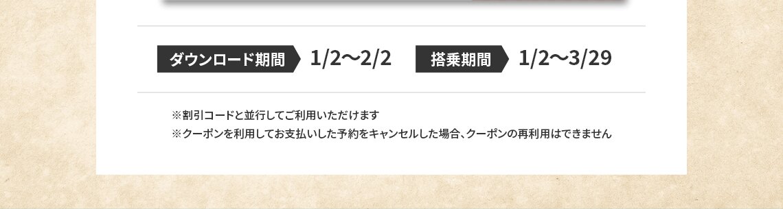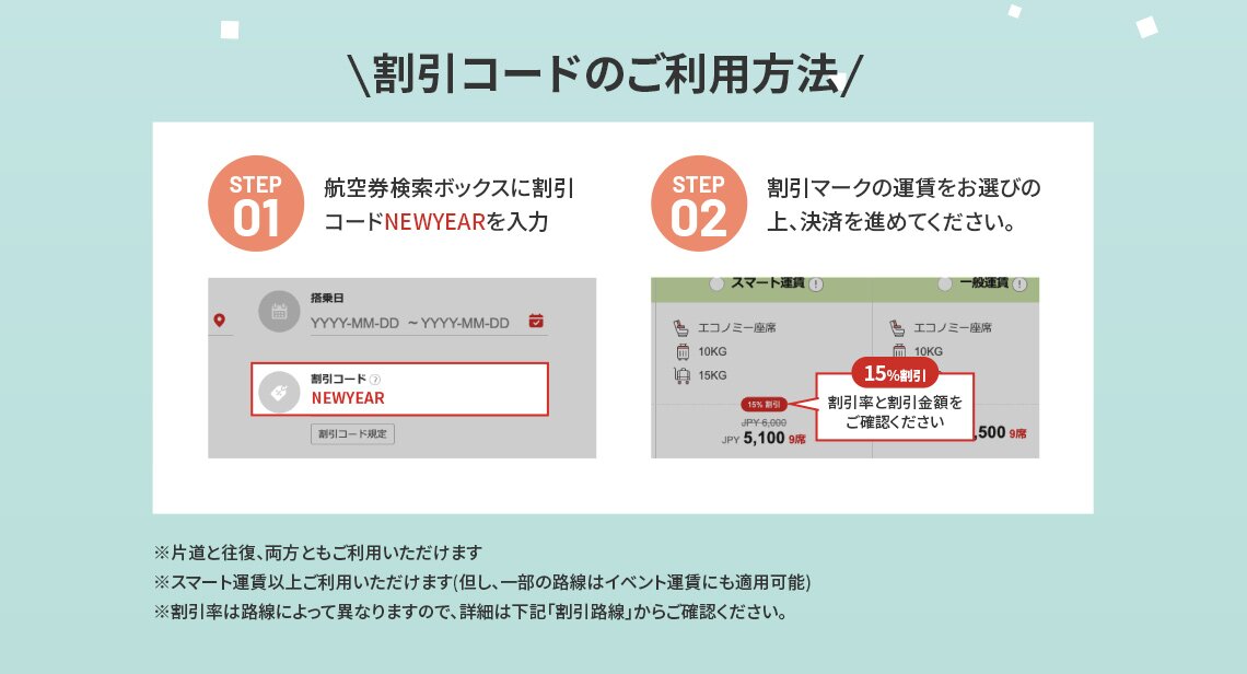 - 営業ポリシーにより、路線別の搭乗期間中に該当割引コードが適用されない日付も発生することがありますので、ご了承ください。