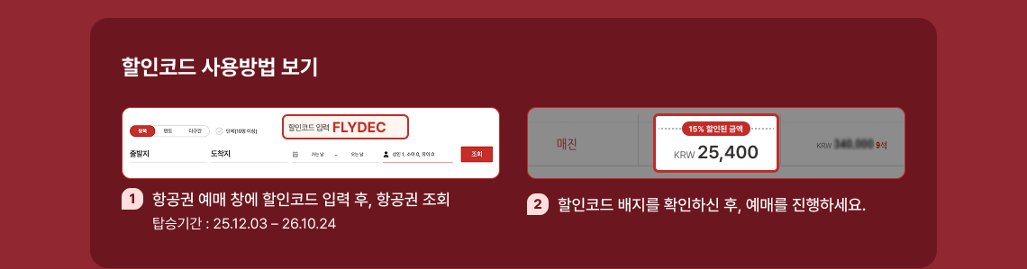 - 할인코드 할인은 출발 공항을 한국 공항으로 선택 후 편도/왕복 예약 시에만 적용됩니다. (출발 공항을 해외로 선택 시 적용 불가)