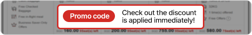 - Please note that there may be cases when the promotion code is not applied during the boarding period for each route depending on the sales policy.