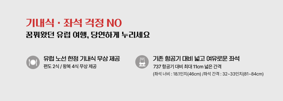- 유럽 노선 한정 기내식 무상 제공 : 편도 2식 / 왕복 4식 무상 제공