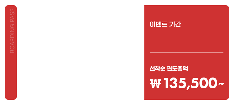 - 이벤트 특가는 최저가 달력 및 최종 운임에 반영되기까지 오픈 시점부터 최장 약 1~2분이 소요될 수 있습니다. 고객님의 너른 양해 부탁드립니다.