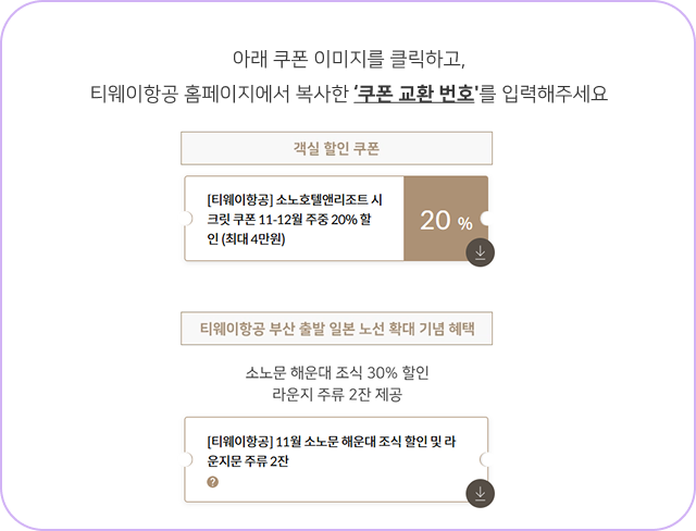 - 할인 내용소노호텔앤리조트 국내 사업장 20% 쿠폰 할인 (최대 40,000원)
