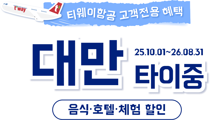 - 본 혜택은 티웨이항공 인천-타이중 노선 편도/왕복 탑승권을 제시하여야 할인이 적용됩니다.