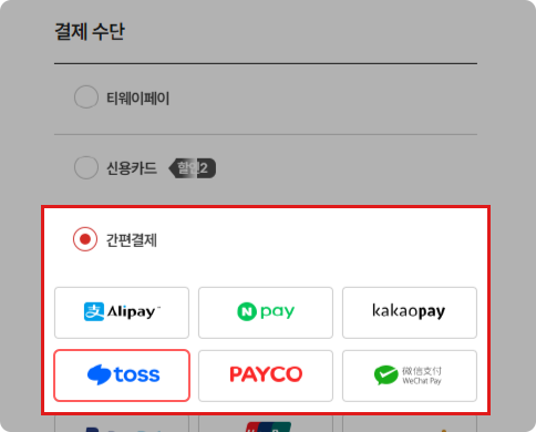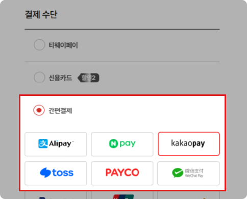 - 결제 오류, 장애, 기타 카드 관련 문의 사항은 각 간편 결제사 또는 카드사 고객센터로 연락해 주시기 바랍니다.