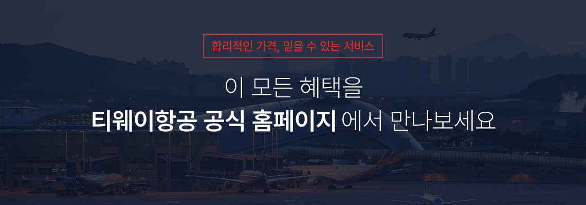 합리적인 가격, 믿을 수 있는 서비스 이모든 혜택을 티웨이항공 공식 홈페이지에서 만나보세요