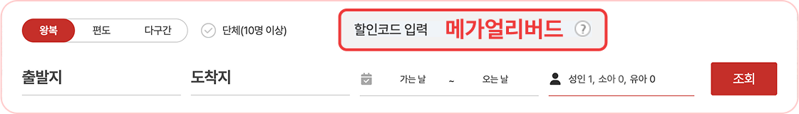 - 할인코드는 편도/왕복 예매 시 모두 사용 가능합니다.