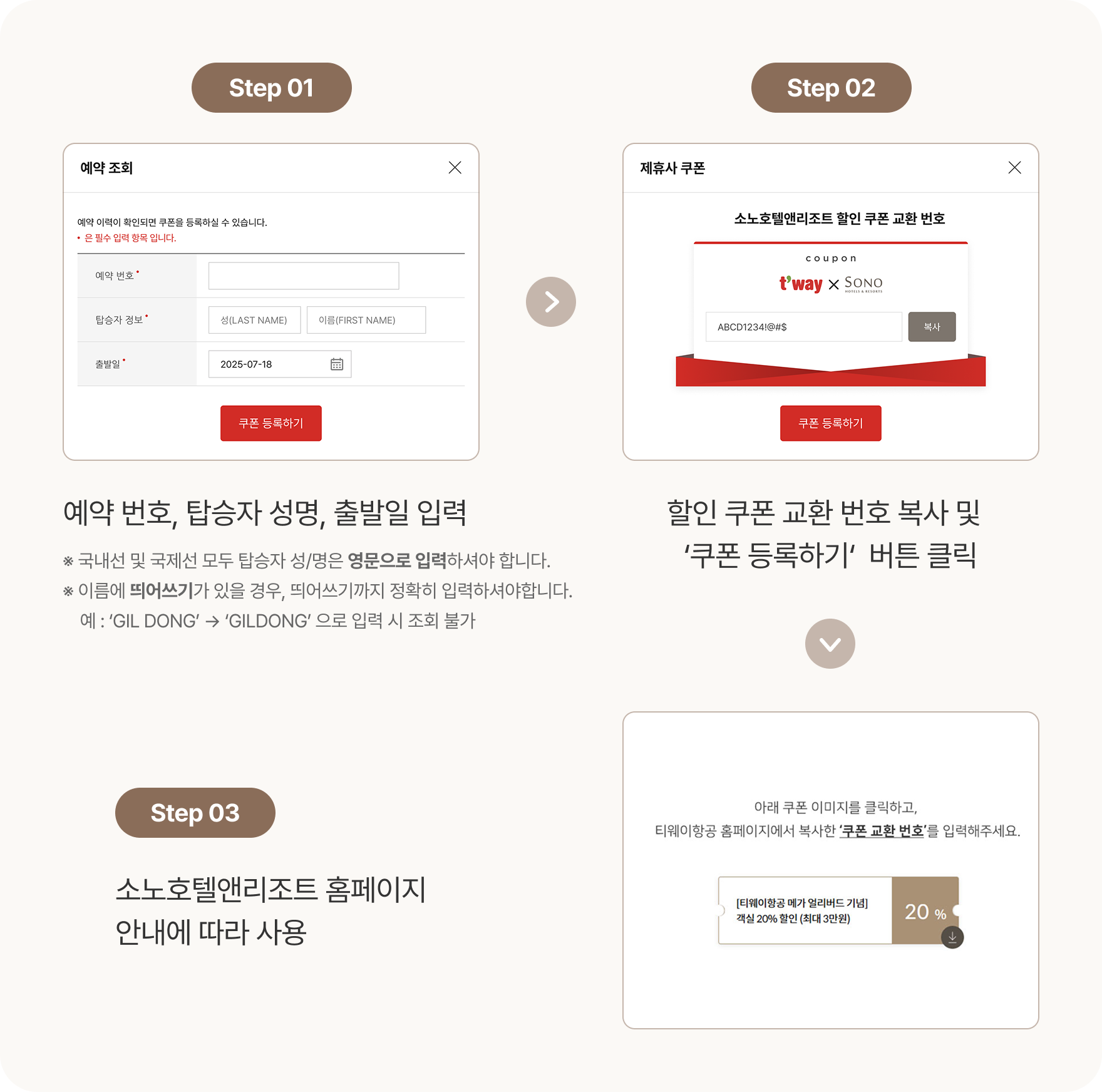 - 티웨이항공은 소노호텔앤리조트 숙박 및 골프장 관련 예약 및 이용에 대한 책임을 지지 않으며, 관련 문의는 소노호텔앤리조트 고객센터(1588 - 4888)를 통해 안내받으시기 바랍니다.