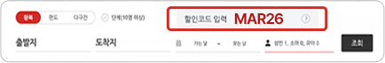 - 할인코드 할인은 출발 공항을 한국 공항으로 선택 후 편도/왕복 예약 시에만 적용됩니다. (출발 공항을 해외로 선택 시 적용 불가)
