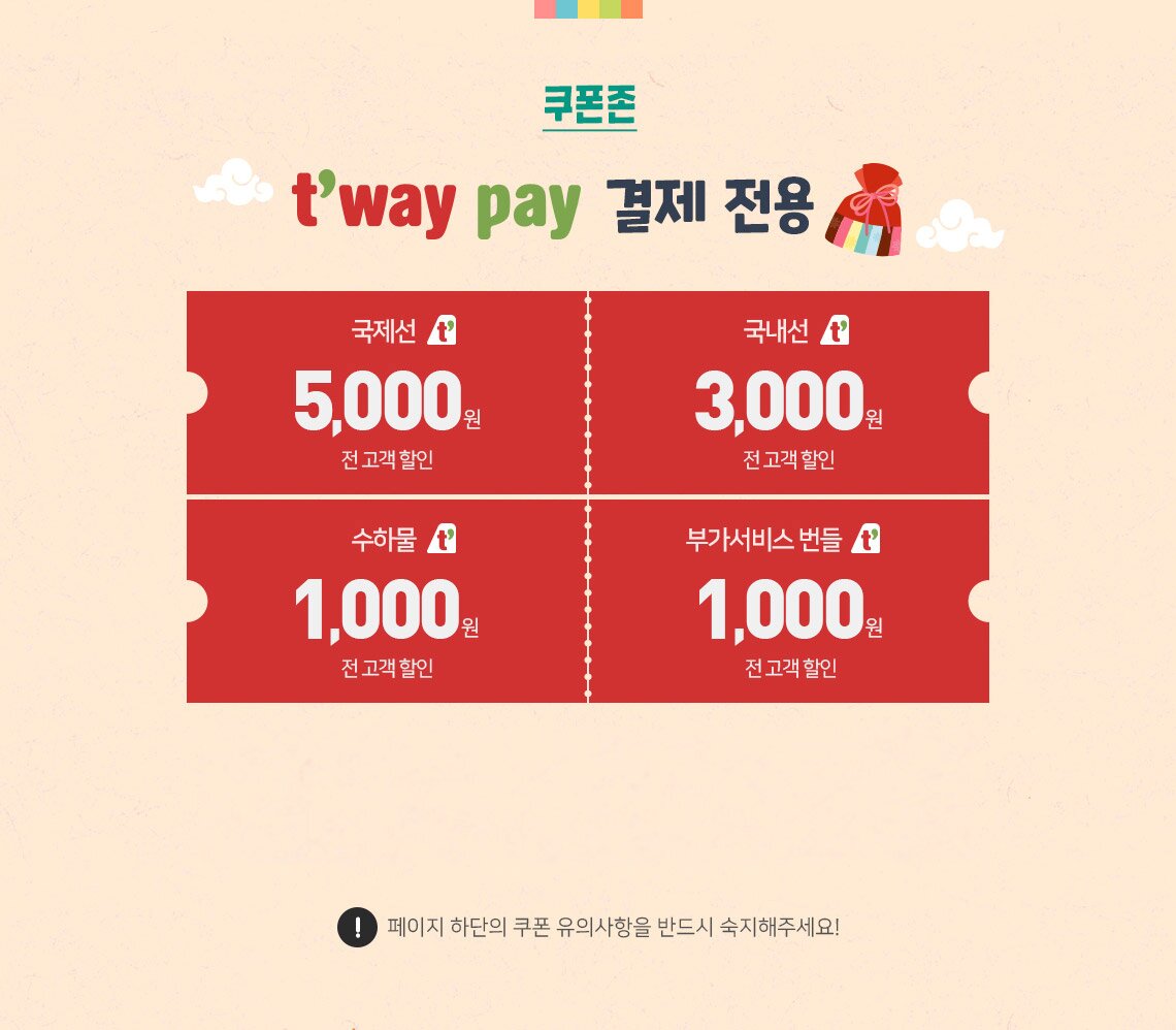 - 티웨이페이 결제 할인에 대한 자세한 내용은 티웨이페이 이벤트 페이지에서 확인 부탁 드립니다. [자세히 보기 ▷]